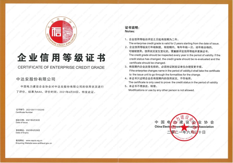 中國(guó)電力建設(shè)企業(yè)協(xié)會(huì)企業(yè)信用等級(jí)證書AAA級(jí)